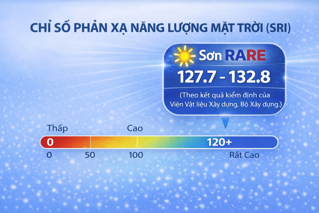 Sơn RARE của hoạt động theo hai cơ chế kết hợp: phản xạ tới 94,6% ánh sáng mặt trời và bức xạ 99% nhiệt ra ngoài khí quyển. Nhờ đó, chỉ số SRI (chỉ số phản xạ năng lượng mặt trời) của sơn RARE đạt mức rất cao từ 127.7–132.8, giúp bề mặt luôn mát hơn xung quanh và đưa nhiệt độ công trình về nhiệt độ không khí dưới bóng râm. Đây là công nghệ “tự làm mát” tiên phong, hiện chưa có sản phẩm khác trên thị trường đạt được.