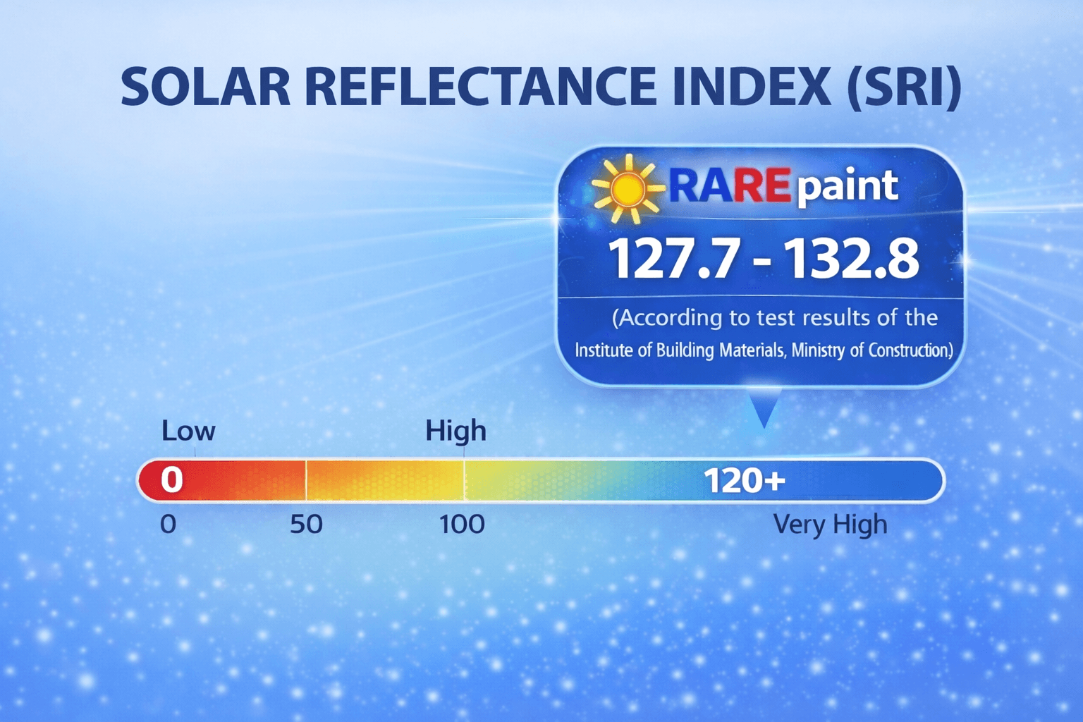 With an ultra-high SRI of 127.7–132.8, RARE keeps surfaces cooler than the surroundings and reduces building temperature to air temperature in the shade. A pioneering “self-cooling” technology unmatched on the market.